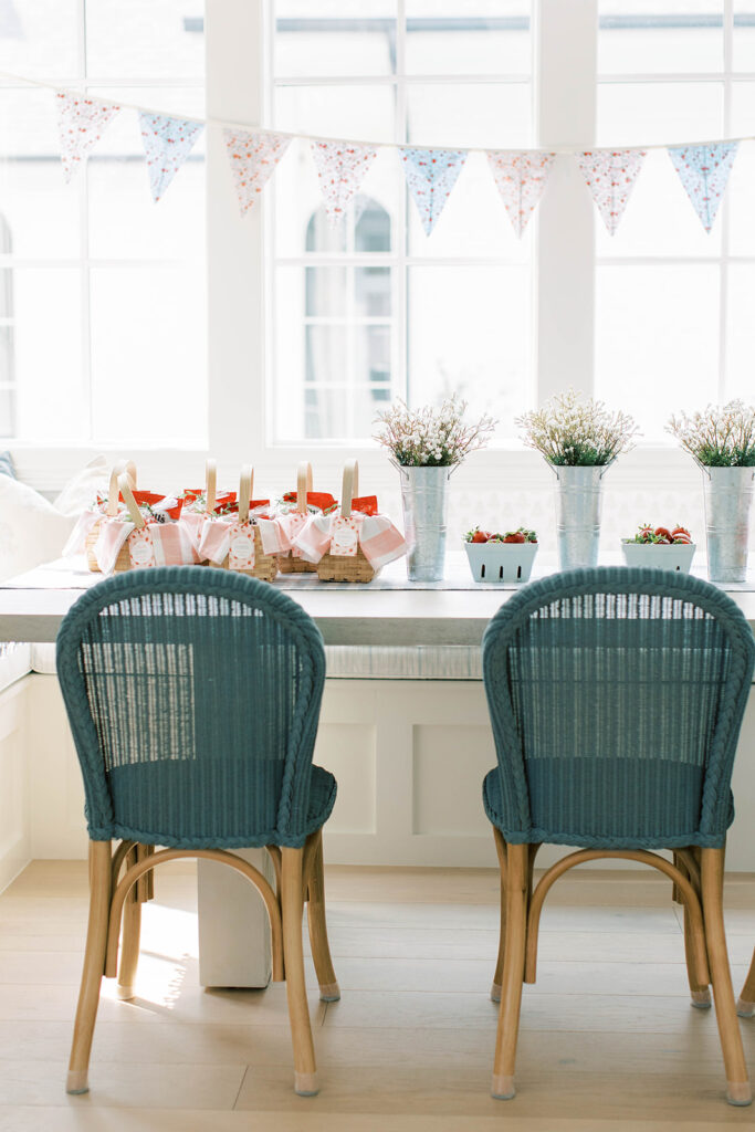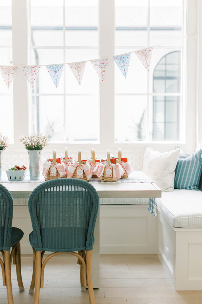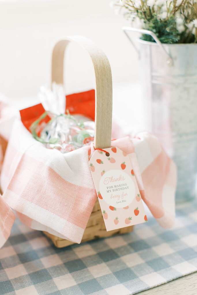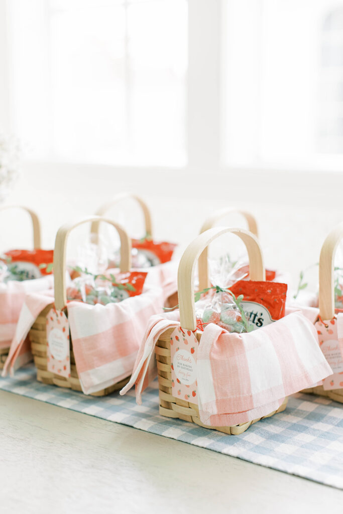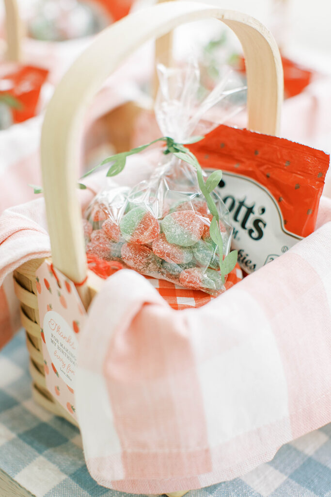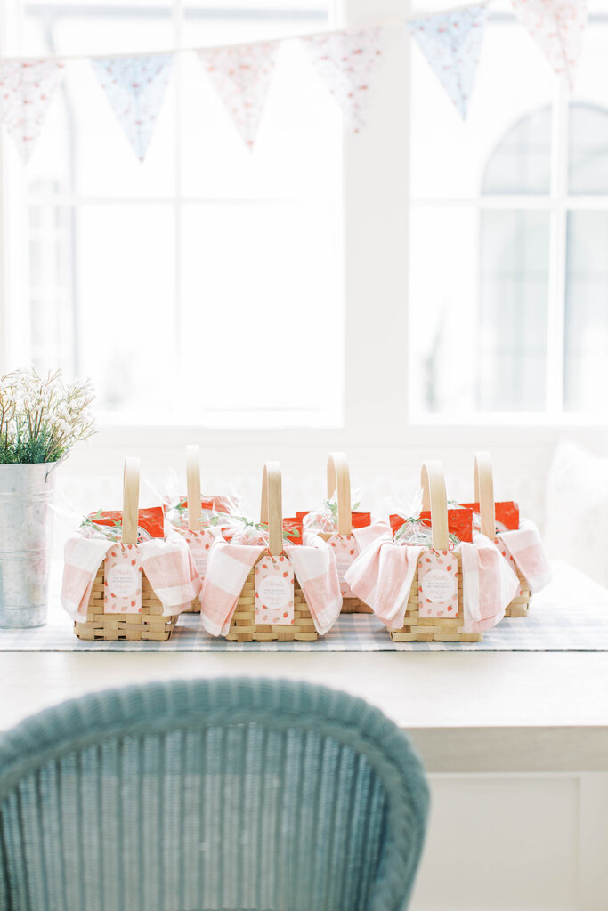 For Ellie’s party, I created little favors designed to resemble miniature picnic baskets. Inside, I curated a collection of strawberry-themed treats guests could enjoy later: