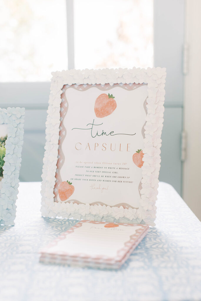 We also included a small display celebrating Ellie’s first year. We had done a family milestone photoshoot, so I framed several photos of her and placed them alongside a milestone fact sheet listing her favorite things. One of my favorite details was the time capsule cards for guests. Each person wrote a note to Ellie that she’ll open on her 18th birthday. I love the idea that she’ll one day read those messages and feel how loved she was from the very beginning.